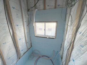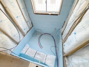 基礎断熱工事を行います。コンクリート基礎の特徴として、地熱の影響を受けることが挙げられますが、基礎断熱工事を行うことで室内の温度が外気温に左右されにくく、温度を一定に保ちやすくなります。