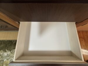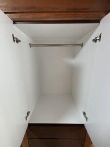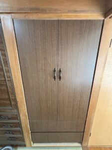和室の押し入れをクローゼット収納に作り変えました。 お部屋の雰囲気とマッチするように、表側は濃いめの茶色で木目調に仕上げました。 |