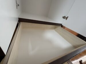 洋室の内装工事が大詰めです! 壁・天井のクロスは白で明るく仕上がってます。 押し入れは可動棚式に作り変え、こちらも中を白で統一感を出しました。 |