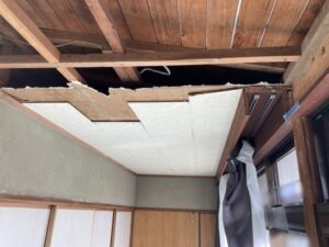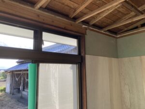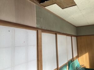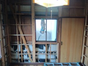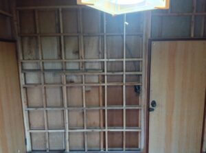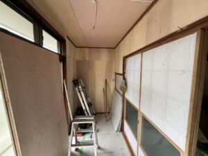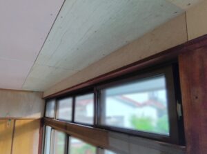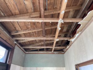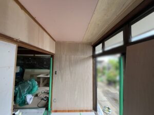 | 天井を解体し、壁は和室と同じく下地材としてベニヤ貼ります。 |