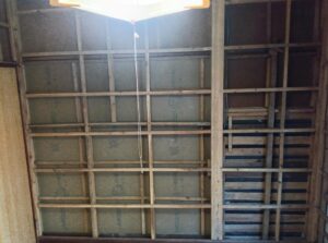 広縁の天井に断熱材を入れ、野縁(のぶち)を組んで仕上げ材のボードを貼っていきます。 ※野縁(のぶち)とは…天井の仕上げ材を留めるための部材 |