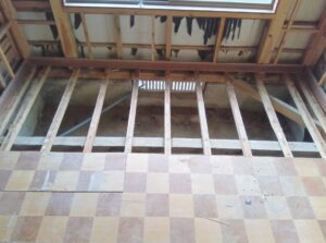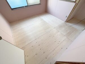 洋室の床の解体が終わったら、下地材のボードを貼ります。 更にこの上に仕上げの床材を貼ります。 |