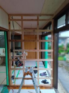 広縁に仕切りの壁を作ります。 枠を組み、間柱(縦の柱)と横胴縁(下地材を留めるための木材)を組んで木下地を作ります。 木下地ができたら壁下地のボードを貼ります。 |