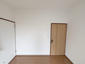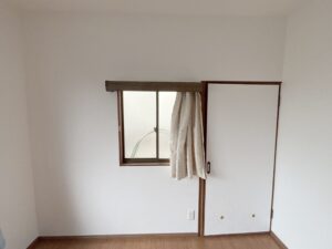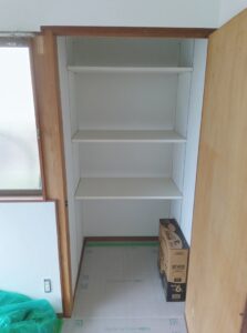 洋室の内装工事が大詰めです! 壁・天井のクロスは白で明るく仕上がってます。 押し入れは可動棚式に作り変え、こちらも中を白で統一感を出しました。 |