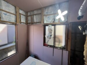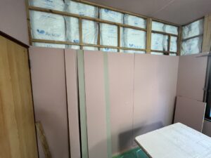 | 洋室の内壁に断熱材を入れ、壁の下地材を貼っていきます。 |