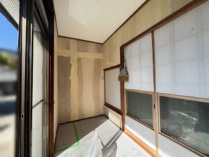 広縁の壁は下地材の継ぎ目をパテで埋めた後にサンディングを行って凹凸を無くし、壁紙を貼っていきます。 壁紙はラタン調でアジアンリゾートの様な明るい壁紙をお選びいただきました! |