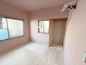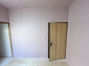 洋室の壁・床・天井の下地材を貼り終わったところです! これから下地処理を行い、それぞれ仕上げ材で仕上げていきます。 |