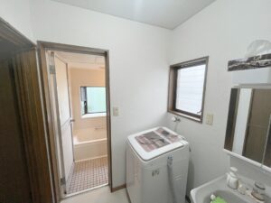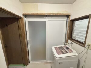 浴室ドアも取り外し、洗面所側の壁紙も剥がします。