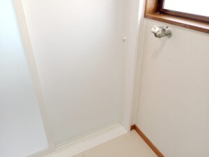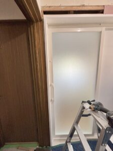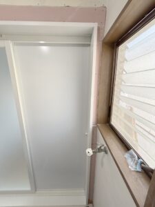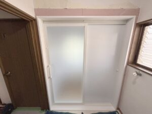 システムバスの扉枠に合わせて壁面は隙間をコンパネで塞ぎ、クロスを貼りなおして仕上げます。