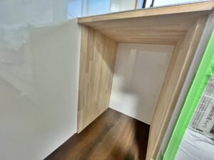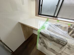 シンク横の空いたスペースに作業棚を造り付けました。天板には壁と同じキッチンパネルを貼って仕上げました。
