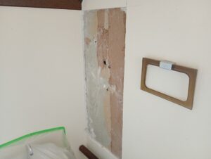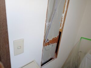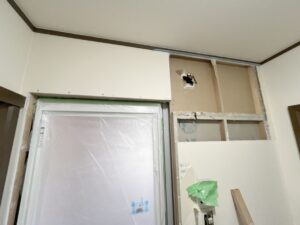 埋込収納棚がありましたが、奥にコーナーキャビネットを付けるため、撤去しました。 |