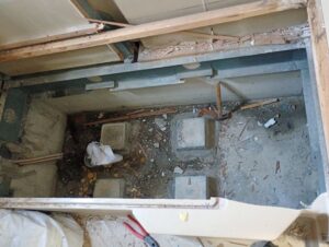 2階のトイレを撤去しました。今空いている穴は給水管(左)と排水管(右)の穴です。こちらはキャップで塞ぎ、フロアシートを貼り替えます。