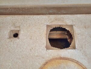 コンセントの位置(右側の穴の部分)が真ん中寄りだった為、奥の壁側に移動させます。真ん中の穴は配線を移動させるために開けた穴です。後ほど塞ぎます。 |
