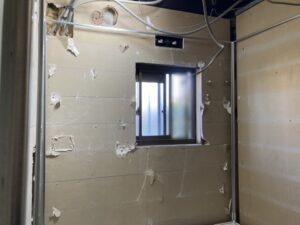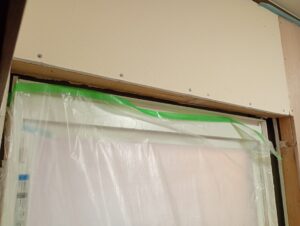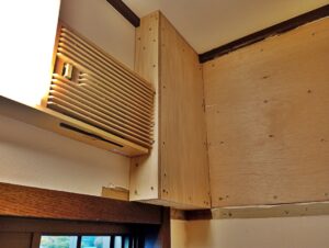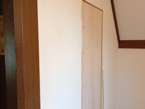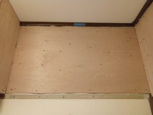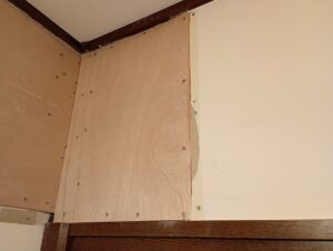 ↑↑ キャビネットを設置するため、 補強材を貼ります。 |