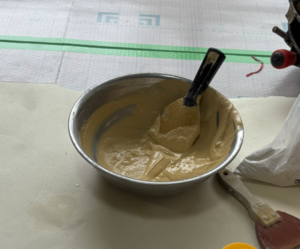 養生が終わる頃、内装職人さんが、粉と水を混ぜ混ぜ・・・