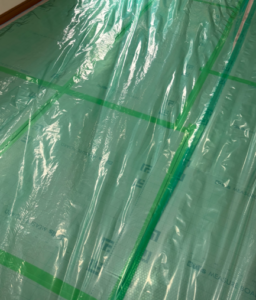 解体後、内装に入る前には、さらにその上から透明のビニールシートで全面を覆い、