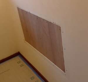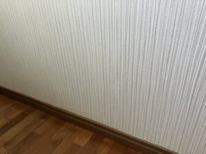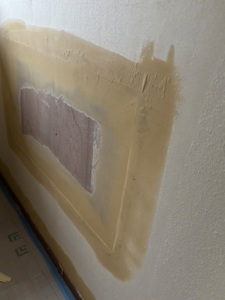 この段階では、板と既存の壁との間に段差やビス跡などがあり、表面が平滑ではありません。
