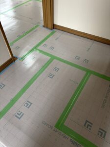 養生板を敷き詰め、テープでしっかりと固定しています。