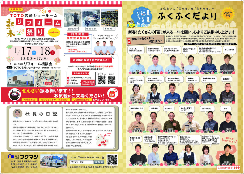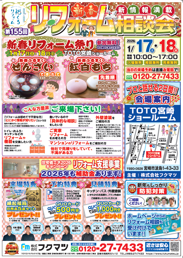 終了 <イベント開催風景>2026🌸新春🌸リフォーム相談会 in TOTO宮崎ショールーム 会場 TOTO宮崎ショールーム 宮崎市波島1-43-33 開催日時 1月17日(土)・1月18日(日)10:00~17:00 参加費 無料