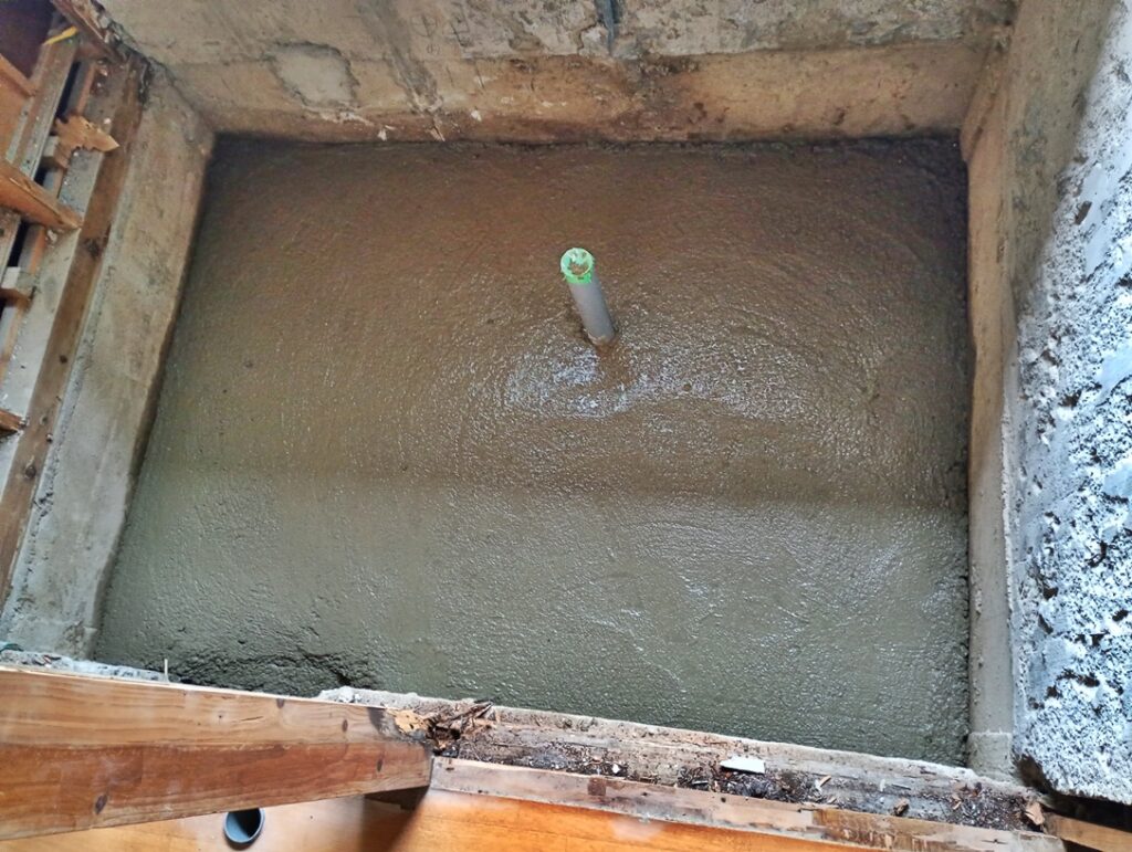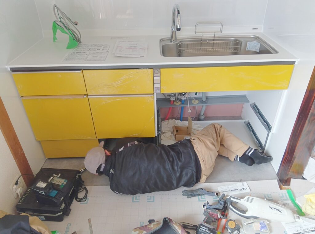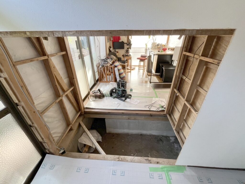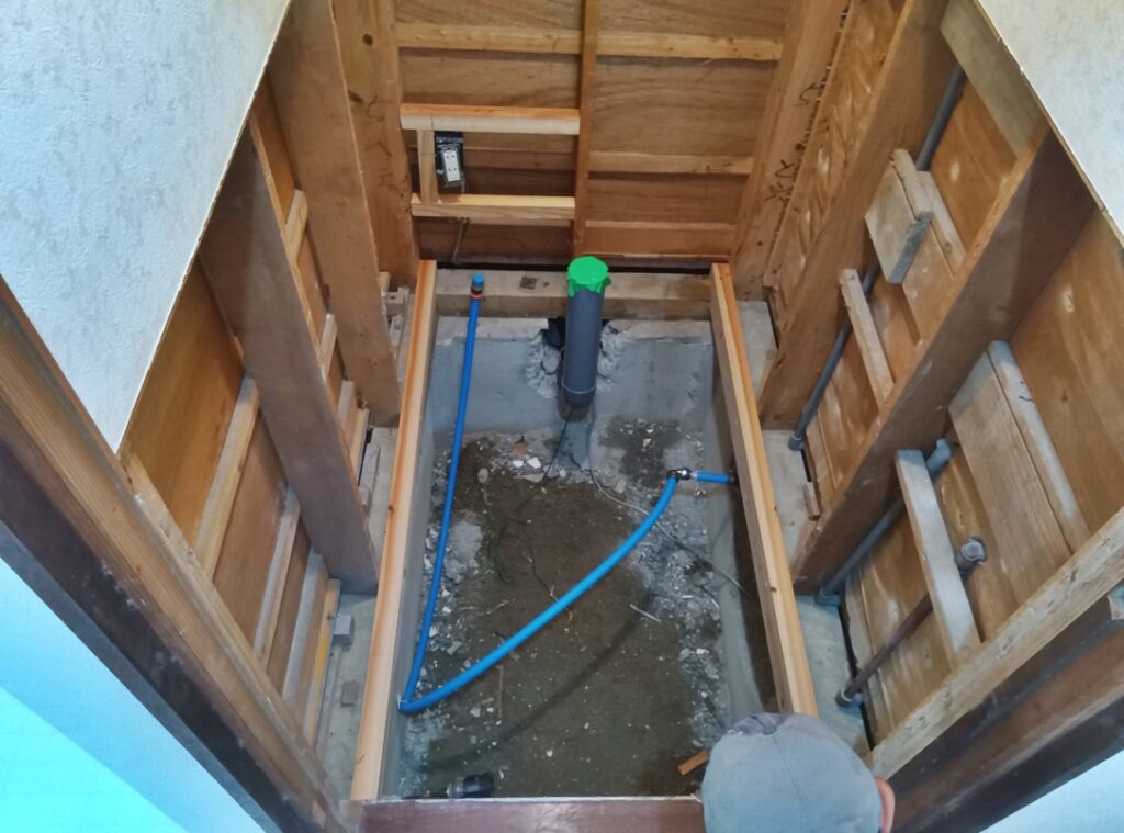 キッチンは移設に伴い、排水管の勾配の確認が必要でした。工事着工前に床下から点検しながら慎重に進めていきました。また浴室は在来浴室のため解体・土間打ち・腐食部の補修工事を行いました。合わせて、エコキュート設置では本体が倒れたりしないよう、しっかりと固定するために基礎工事や、既存のガス管を塞ぐ工事、新たな電気工事が必要でした。