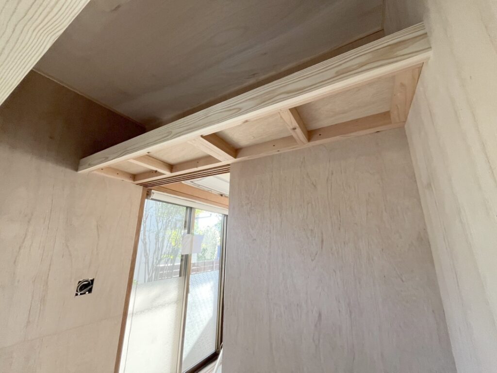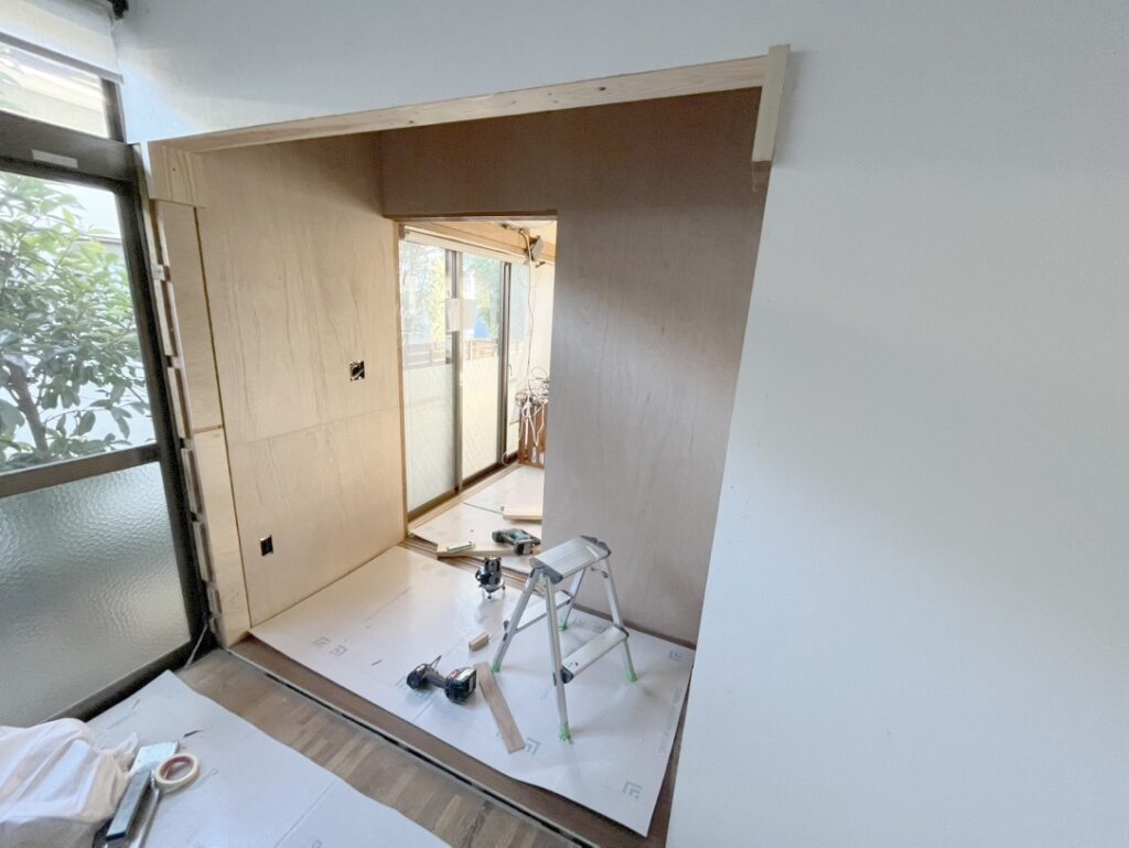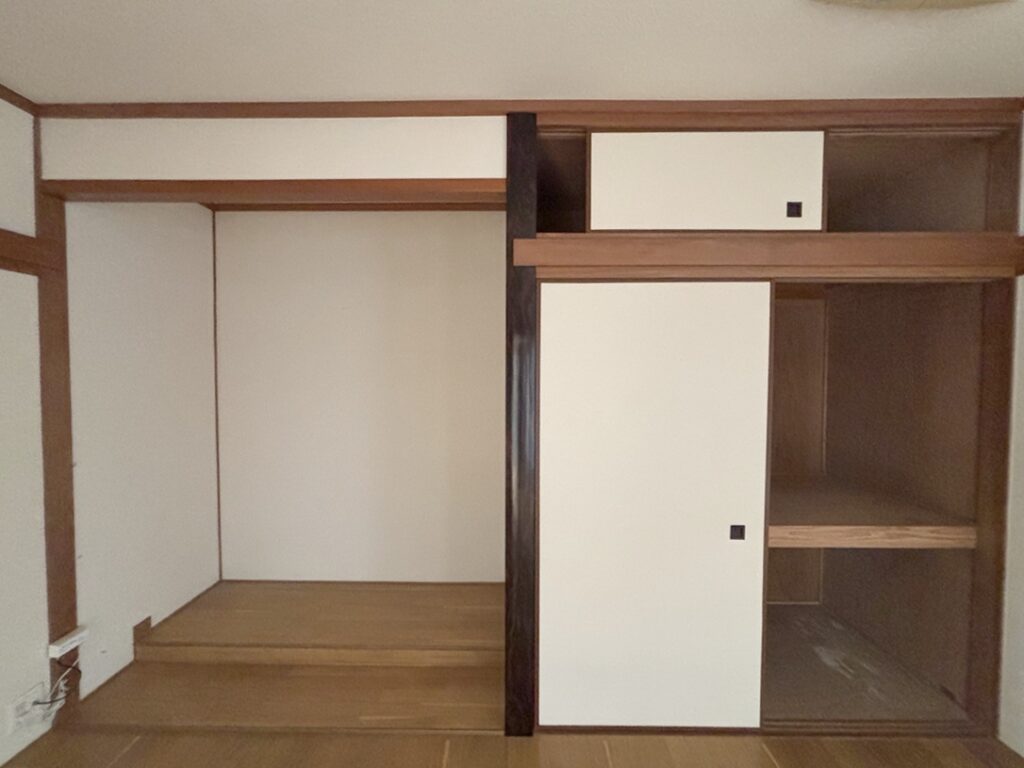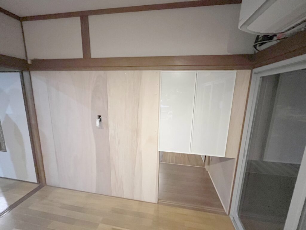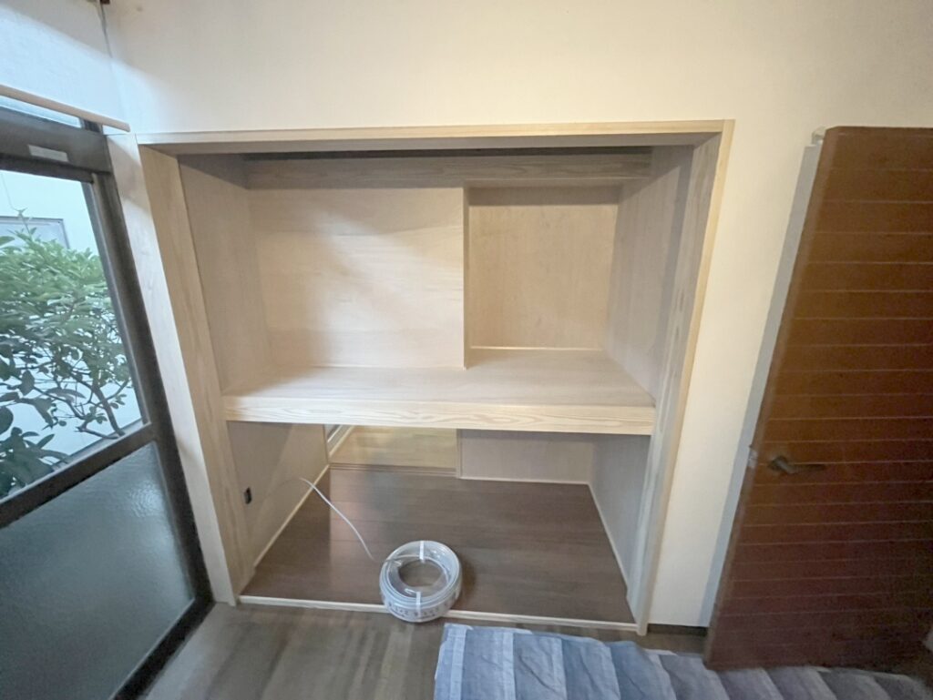 今回メインとなった木工事は、押入れ部分になります。リビング側の壁面にテレビを設置したいということから、洋室側から使える収納へとプランニングしました。また、収納右下の部分は、リビングと洋室を通り抜けれるように開口されており、ワンちゃん専用の空間となっています。お客様のご提案に私たちも勉強させていただきました。