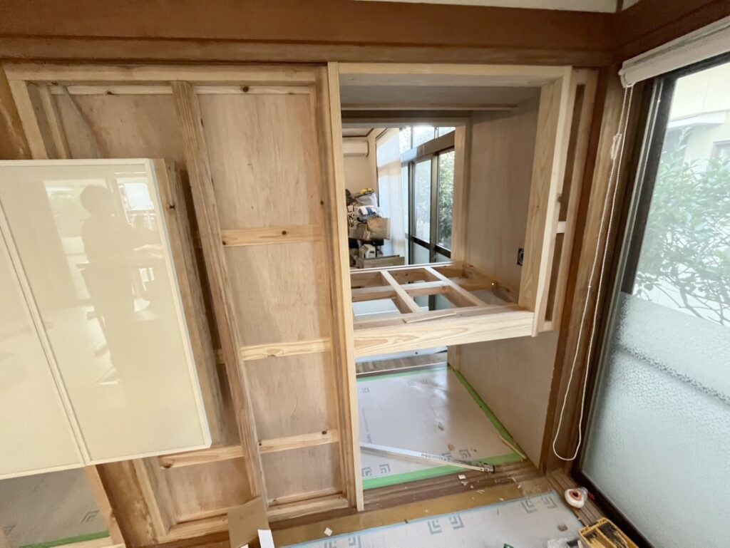 水まわり工事では、キッチンの移設を含む設備工事。木工事では押入れの仕様変更など、暮らしの中でより使いやすく、快適に生活が送れるようにと工夫されたプランニングです。