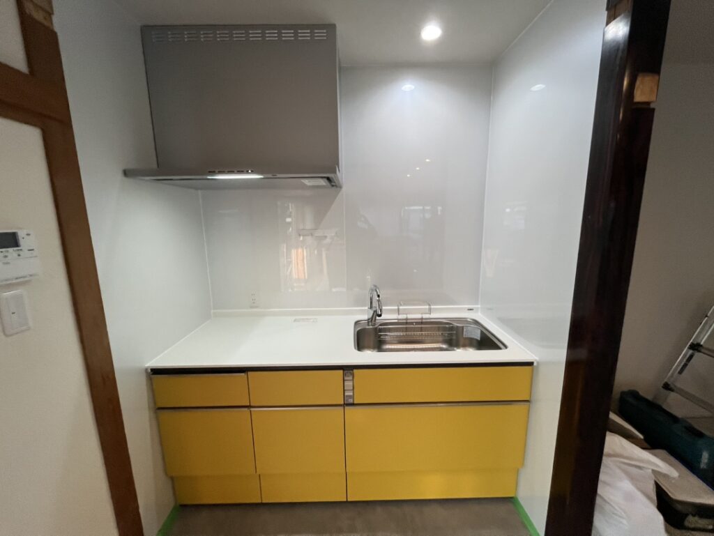 水まわりが一新されました。浴室は大きな窓がありましたが、窓からの冷気は断熱効率を下げるのでユニットバス工事の際に窓を塞ぎました。キッチンはリフォーム前のタイルを思い出すような、黄色の面材をセレクト。 動線が整い、コンパクトながらも日々の調理や片付けがスムーズになりました。最新設備によりお手入れがしやすくなり、これからの暮らしを支える住まいへと整いました。